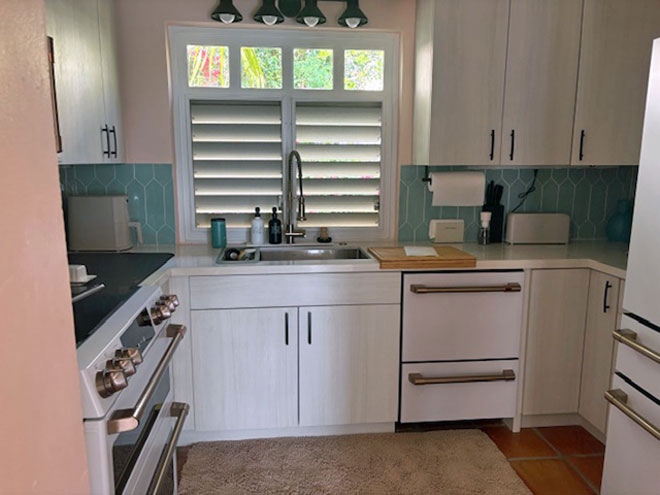 Off the living room is the fully equipped new enlarged redone kitchen.