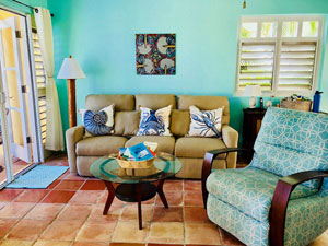 The great room opens up to the private pool deck, features comfortable colorful furnishings, a 50" flat screen TV, ceiling fan, slider hideaway screens on all french door openings throughout and access into the prime master bedroom and newly renovated upscale kitchen area.