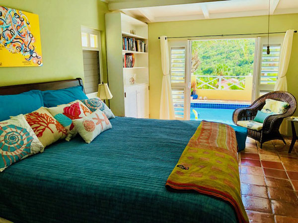 The second master bedroom suite is upbeat in tropical colors and features a queen size bed, wall unit air conditioning, ceiling fan, bath ensuite and views out to the deck. The arrangement is perfect for two couples traveling together!